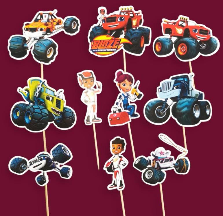 Komplet od 10 kartonskih topera, sa temom Blaze, za dekorisanje. Toperi su visine oko 8cm, i svaki je zalepljen za drveni stapić.