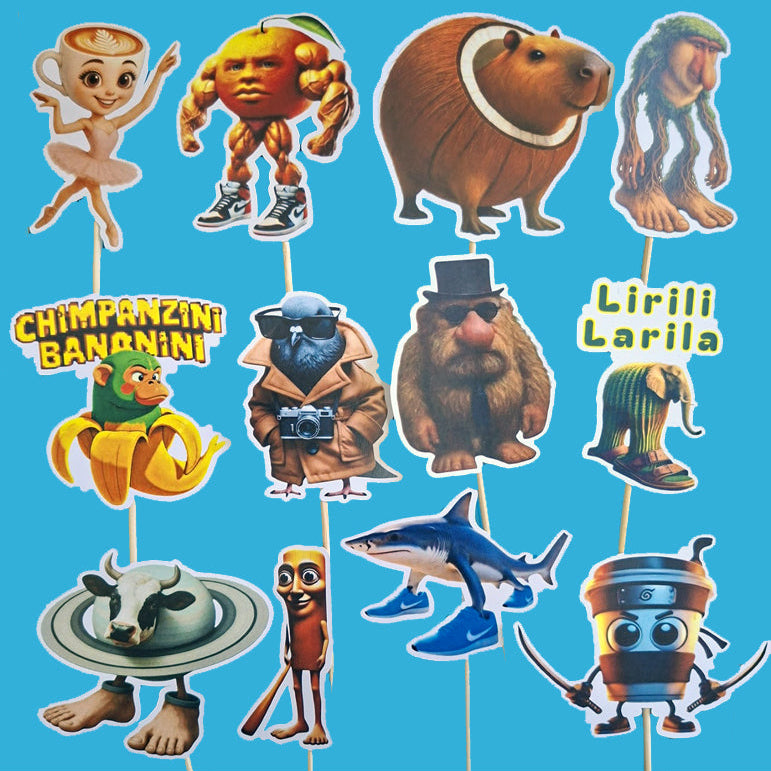 Komplet od 12 kartonskih topera, sa temom Italian Brainrot, za dekorisanje. Toperi su visine oko 8cm, i svaki je zalepljen za drveni stapić.
