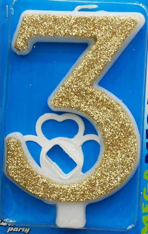 Mega rođendanska svećica broj 3. Svećica je zlatne boje sa šljokicama. Svećica je visine 12 cm. Uz svećicu se dobije i postolje za tortu.