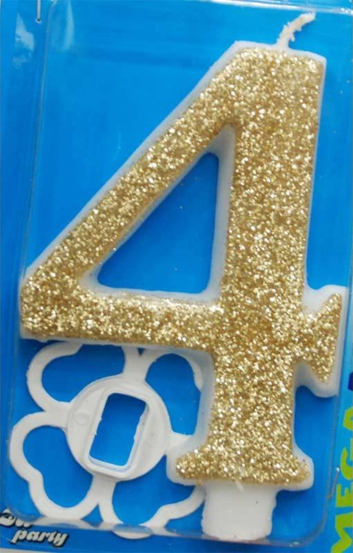 Mega rođendanska svećica broj 4. Svećica je zlatne boje sa šljokicama. Svećica je visine 12 cm. Uz svećicu se dobije i postolje za tortu.