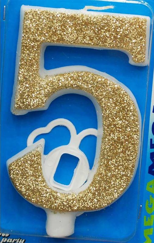 Mega rođendanska svećica broj pet. Svećica je zlatne boje sa šljokicama. Svećica je visine 12 cm. Uz svećicu se dobije i postolje za tortu.