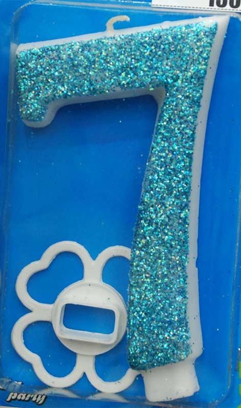 Mega rođendanska svećica broj sedam. Svećica je plave boje sa šljokicama. Svećica je visine 12 cm. Uz svećicu se dobije i postolje za tortu.