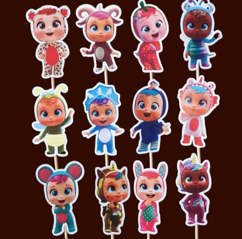 Komplet od 12 kartonskih topera, sa temom Cry babies, za dekorisanje. Toperi su visine oko 8cm, i svaki je zalepljen za drveni stapić.