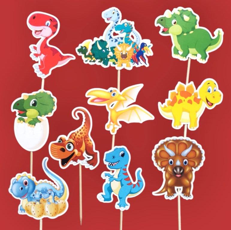 Komplet od 10 kartonskih topera, sa temom Dinosaurusa, za dekorisanje. Toperi su visine oko 8cm, i svaki je zalepljen za drveni stapić.