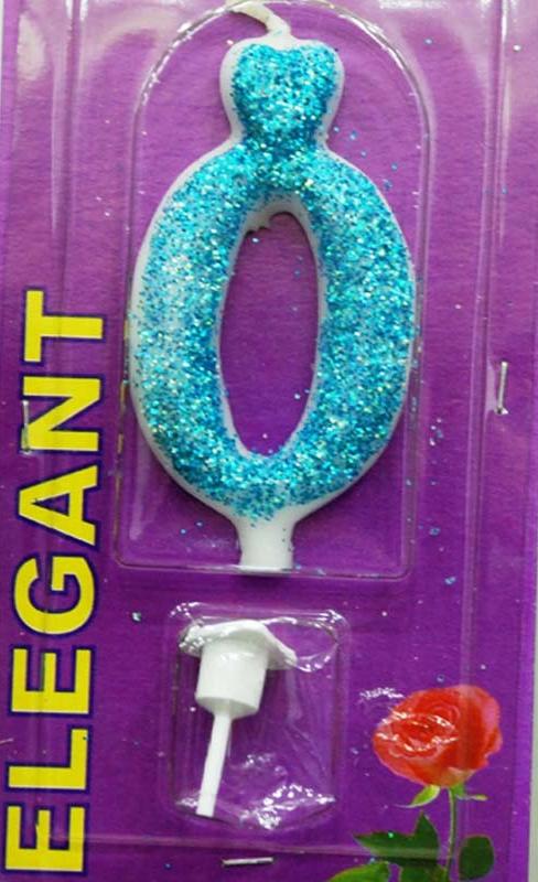 Elegant rođendanska svećica broj 0, plave boje sa šljokicama. Svećica je visine 8 cm. U pakovanju se nalazi i belo postolje za svećicu.