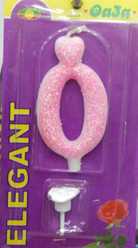 Elegant rođendanska svećica broj 0, roze boje sa šljokicama. Svećica je visine 8 cm. U pakovanju se nalazi i belo postolje za svećicu.