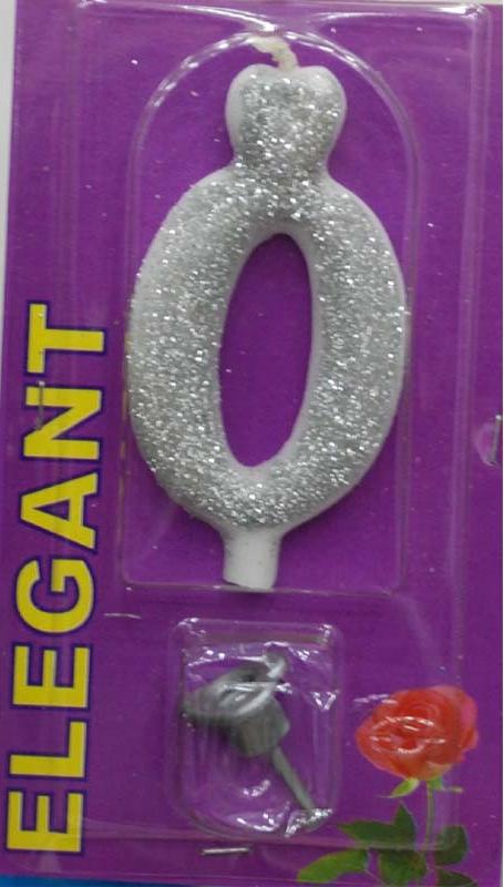 Elegant rođendanska svećica broj 0, srebrne boje sa šljokicama. Svećica je visine 8 cm. U pakovanju se nalazi i srebrno postolje za svećicu.