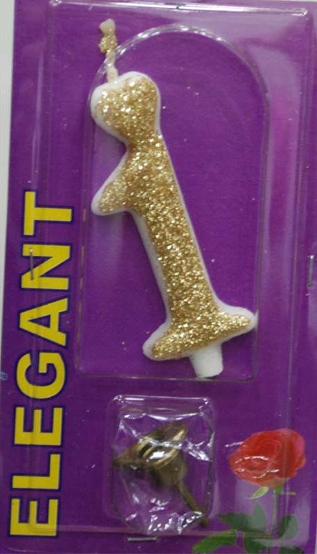 Svećica u obliku broja 1 zlatne boje sa šljokicama i postoljem, veličine 8 cm. Kvalitetna svećica za rođendan, domaće proizvodnje. Ukrasite tortu i neka slavljenjik uz zamišljenu želju ugasi ovu svećicu.