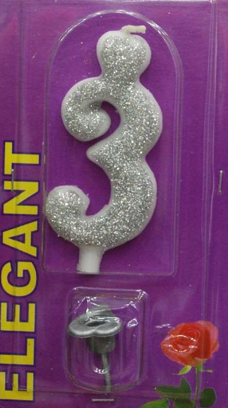 Elegant rođendanska svećica broj 3, srebrne boje sa šljokicama. Svećica je visine 8 cm. U pakovanju se nalazi i srebrno postolje za svećicu.