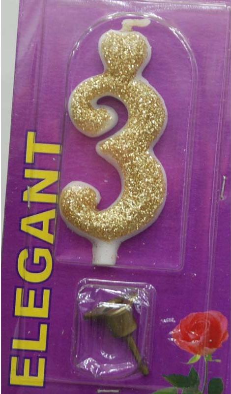 Elegant rođendanska svećica broj 3, zlatne boje sa šljokicama. Svećica je visine 8 cm. U pakovanju se nalazi i zlatno postolje za svećicu.