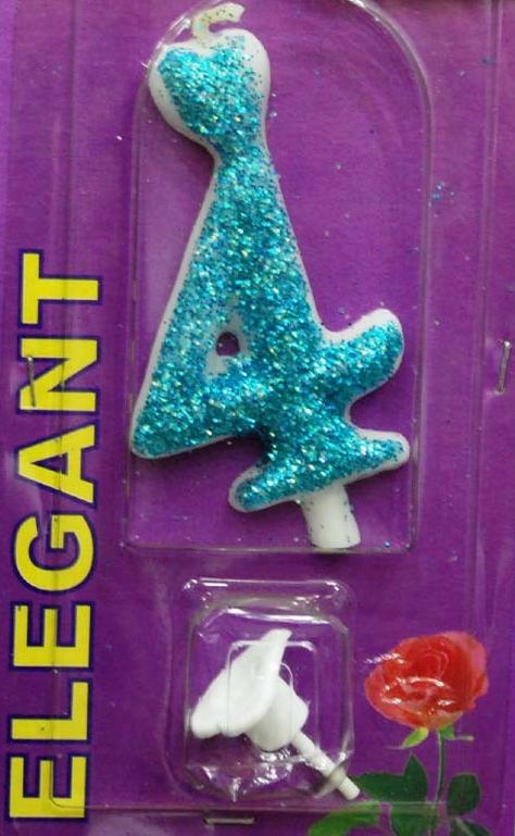 Svećica u obliku broja 4 plave boje sa šljokicama i postoljem, veličine 8 cm. Kvalitetna svećica za rođendan, domaće proizvodnje. Ukrasite tortu i neka slavljenjik uz zamišljenu želju ugasi ovu svećicu.