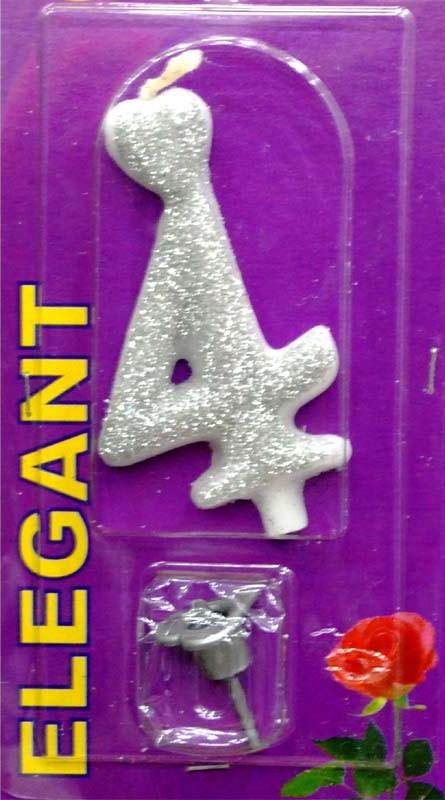 Elegant rođendanska svećica broj 4, srebrne boje sa šljokicama. Svećica je visine 8 cm. U pakovanju se nalazi i srebrno postolje za svećicu.