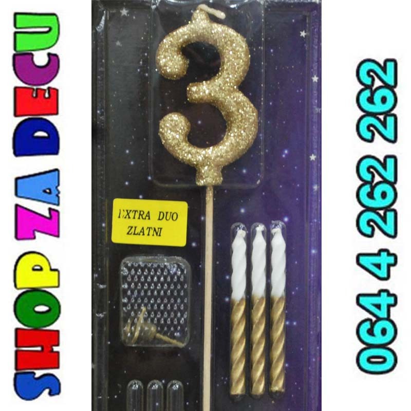 Svećice Extra duo zlatna u pakovanju se nalaze broj 3 na dugačkom štapiću i i tri svećice zlatno bele boje sa postoljem, ukupna dužina svećice je 24cm. Ukrasite tortu i neka slavljenik uz zamišljenu želju ugasi ovu svećicu.