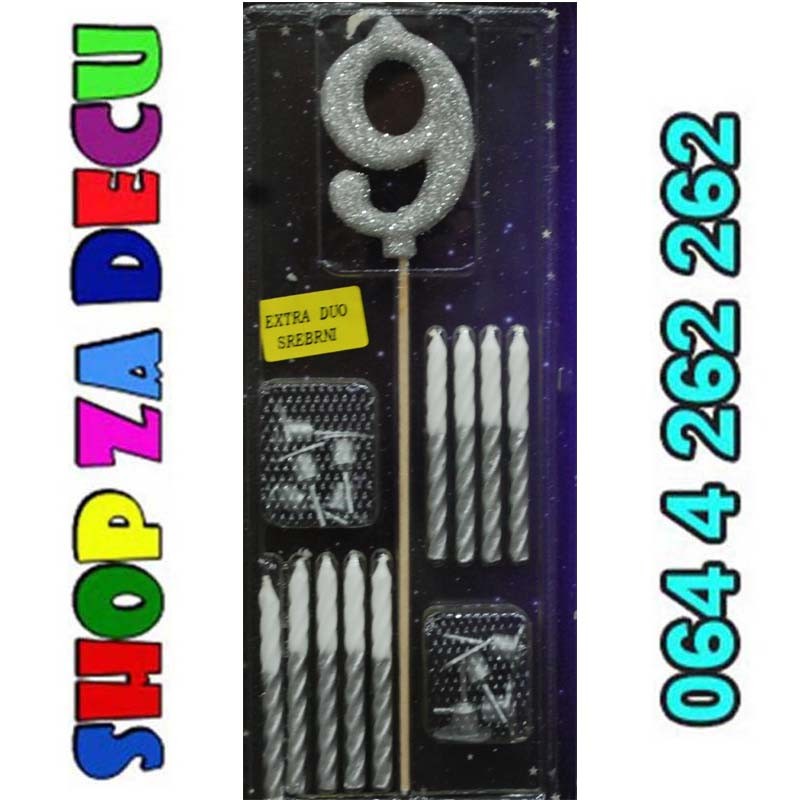 Svećice Extra duo srebrna u pakovanju se nalaze broj 9 na dugačkom štapiću i i devet svećica srebrno bele boje sa postoljem, ukupna dužina svećice je 24cm.