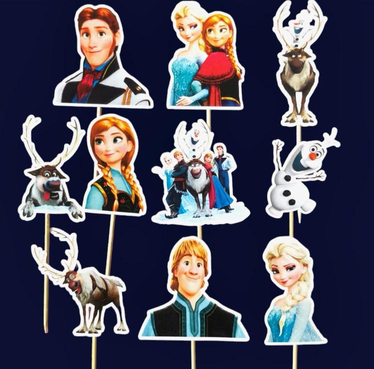 Komplet od 10 kartonskih topera, sa temom Frozen, za dekorisanje. Toperi su visine oko 8cm, i svaki je zalepljen za drveni stapić.
