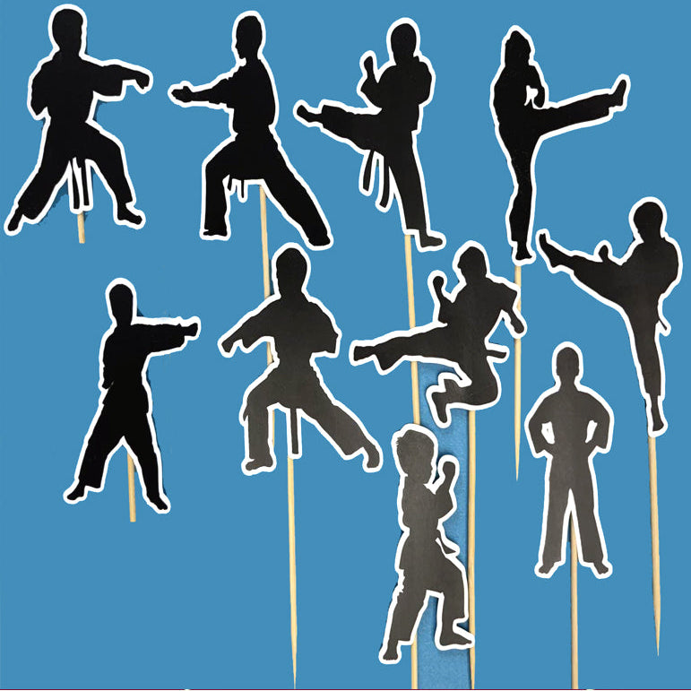 Komplet od 10 kartonskih topera, sa temom karate, za dekorisanje. Toperi su visine oko 8cm, i svaki je zalepljen za drveni stapić.