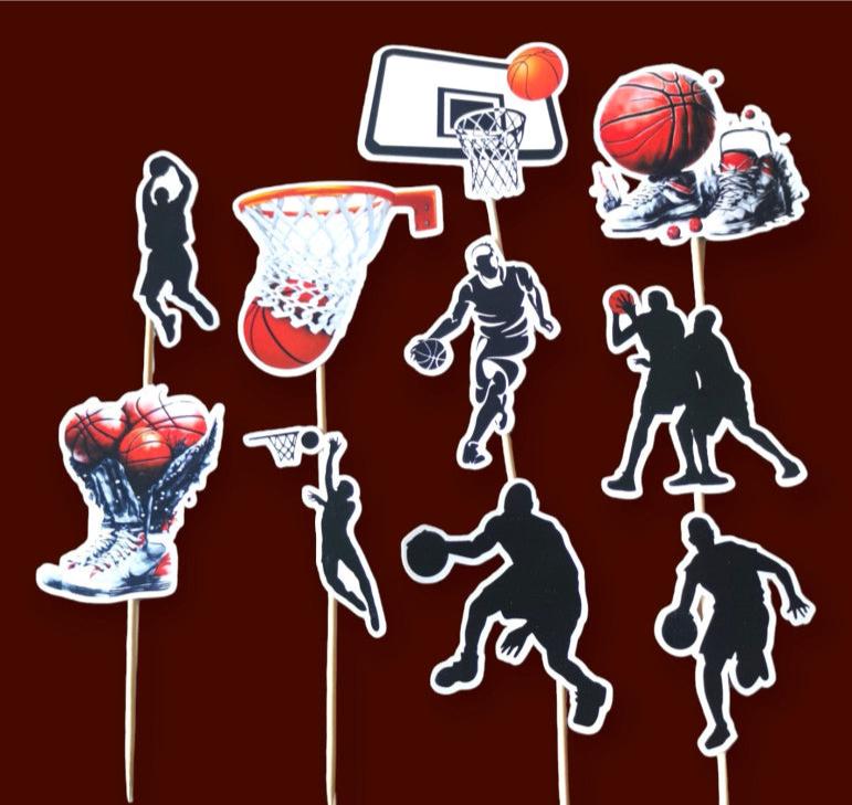 Komplet od 10 kartonskih topera, sa temom Košarke, za dekorisanje. Toperi su visine oko 8cm, i svaki je zalepljen za drveni stapić.