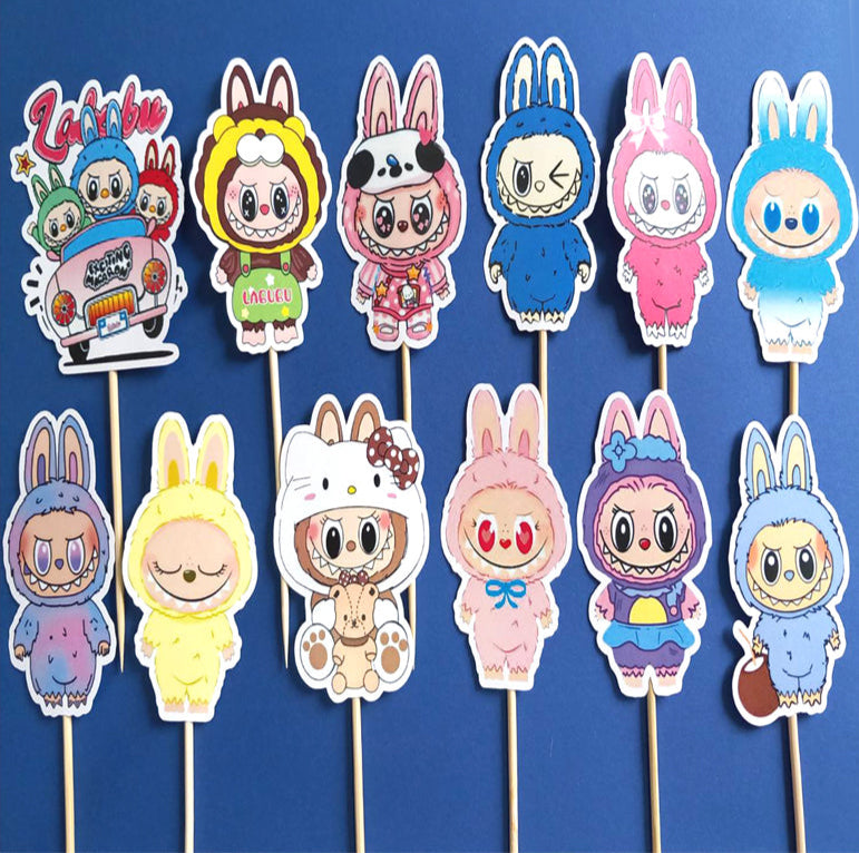 Komplet od 12 kartonskih topera, sa temom Labubu, za dekorisanje. Toperi su visine oko 8cm, i svaki je zalepljen za drveni stapić.