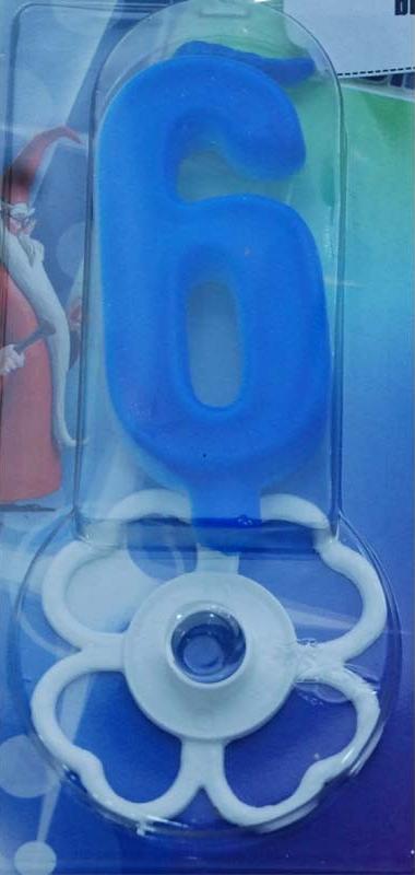 Svećica magicni broj 6 plave boje sa belim postoljem, svećica se pali sama 15 sekundi posle gašenja, svećica je veličine 7cm.
