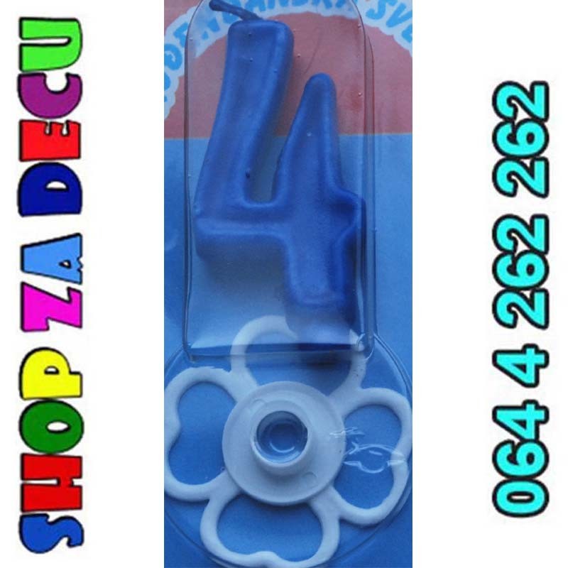 Svećica mali broj plavi boje broj 4, veličina svećice je 7 cm, postolje je u beloj boji.