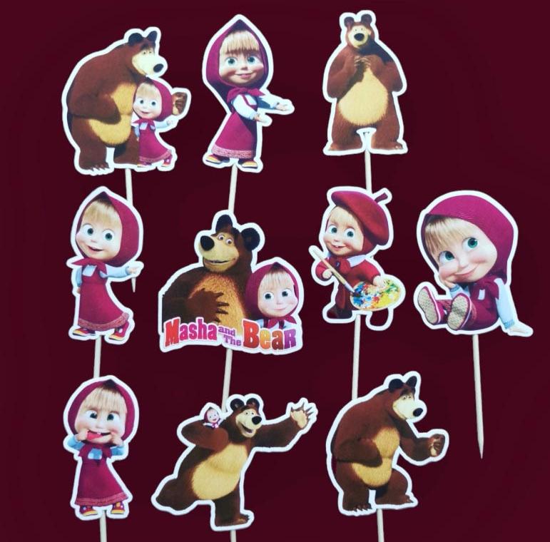 Komplet od 10 kartonskih topera, sa temom Maša i meda, za dekorisanje. Toperi su visine oko 8cm, i svaki je zalepljen za drveni stapić.