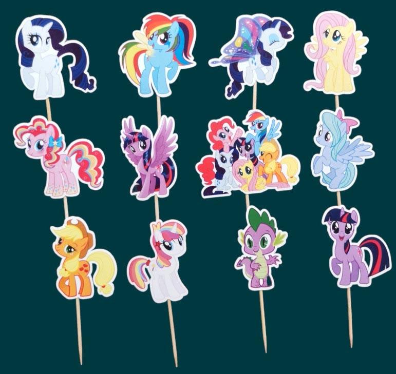Komplet od 12 kartonskih topera, sa temom My little pony, za dekorisanje. Toperi su visine oko 8cm, i svaki je zalepljen za drveni stapić.