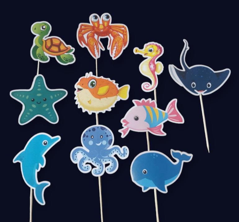 Komplet od 10 kartonskih topera, sa temom Morski svet, za dekorisanje. Toperi su visine oko 8cm, i svaki je zalepljen za drveni stapić.