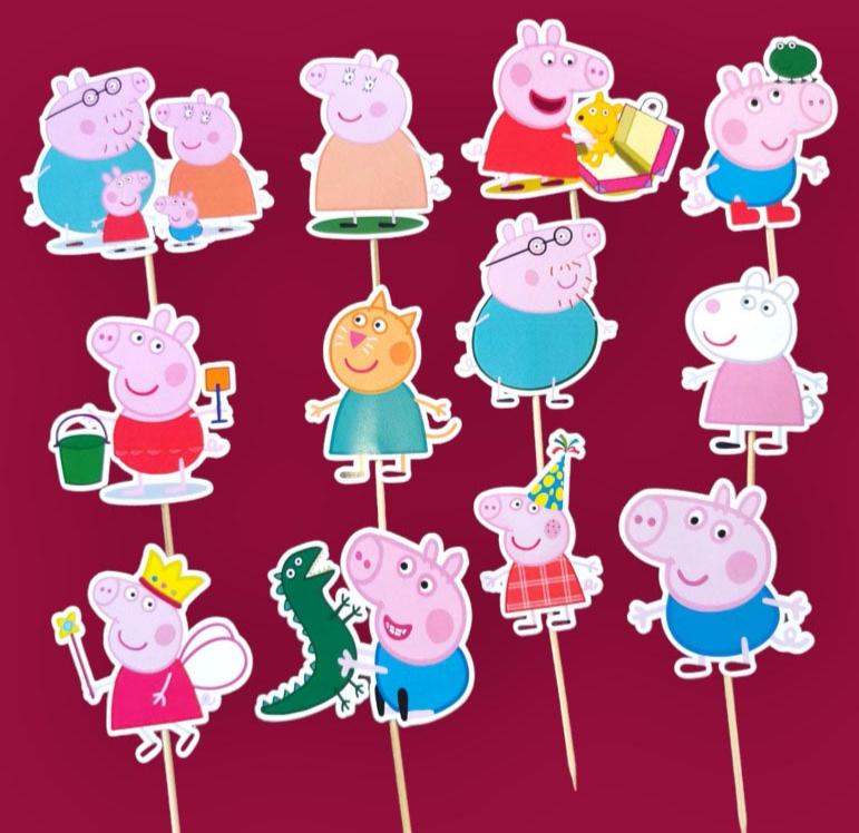 Komplet od 12 kartonskih topera, sa temom Pepa Prase, za dekorisanje. Toperi su visine oko 8cm, i svaki je zalepljen za drveni stapić.