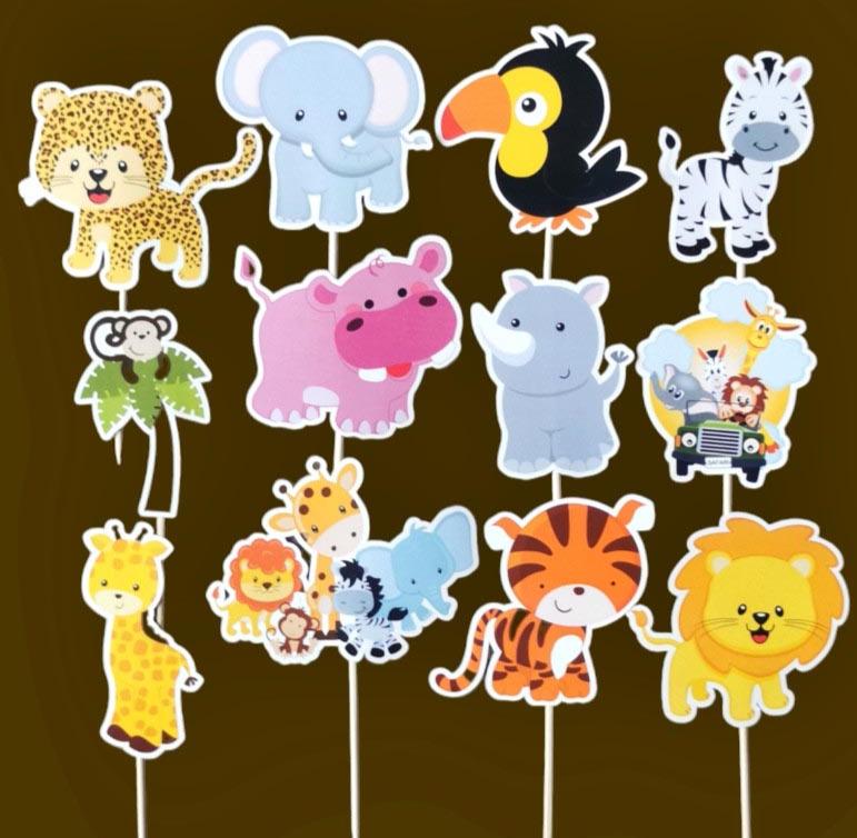 Komplet od 12 kartonskih topera, sa temom Safari zivotinja, za dekorisanje. Toperi su visine oko 8cm, i svaki je zalepljen za drveni stapić.