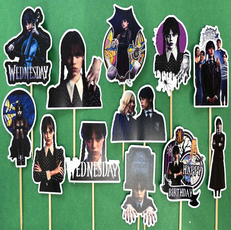 Komplet od 12 kartonskih topera, sa temom Sreda Adams - Wednesday Addams, za dekorisanje. Toperi su visine oko 8cm, i svaki je zalepljen za drveni stapić.