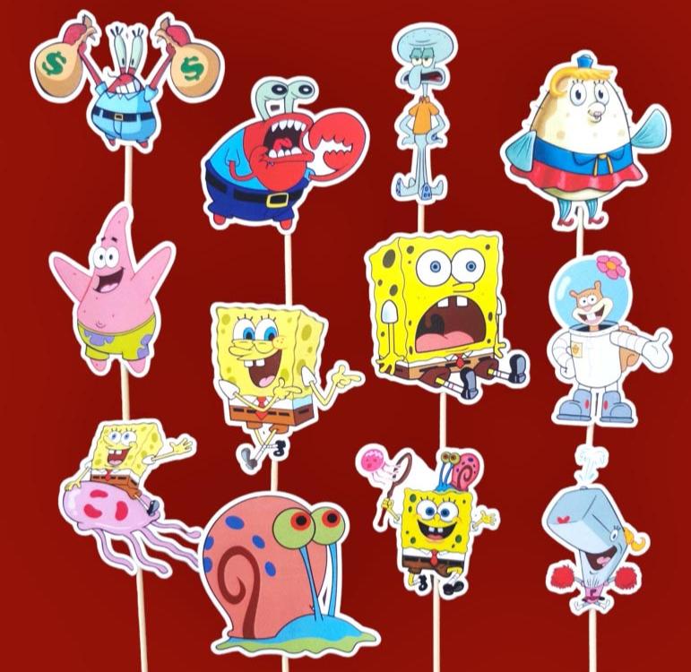 Komplet od 12 kartonskih topera, sa temom Sundjer Bob, za dekorisanje. Toperi su visine oko 8cm, i svaki je zalepljen za drveni stapić.