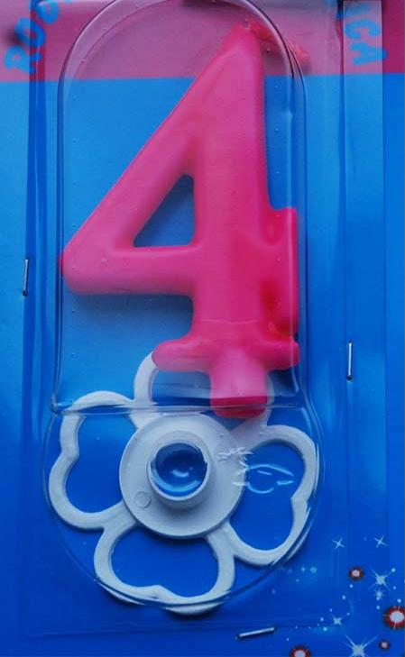 Rođendanska svećica broj 4, roze boje. Svećica je visine 8 cm. U pakovanju se nalazi i belo postolje za svećicu.