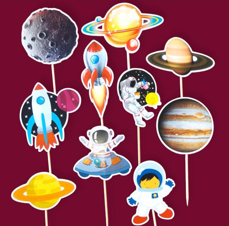 Komplet od 10 kartonskih topera, sa temom Svemir, za dekorisanje. Toperi su visine oko 8cm, i svaki je zalepljen za drveni stapić.